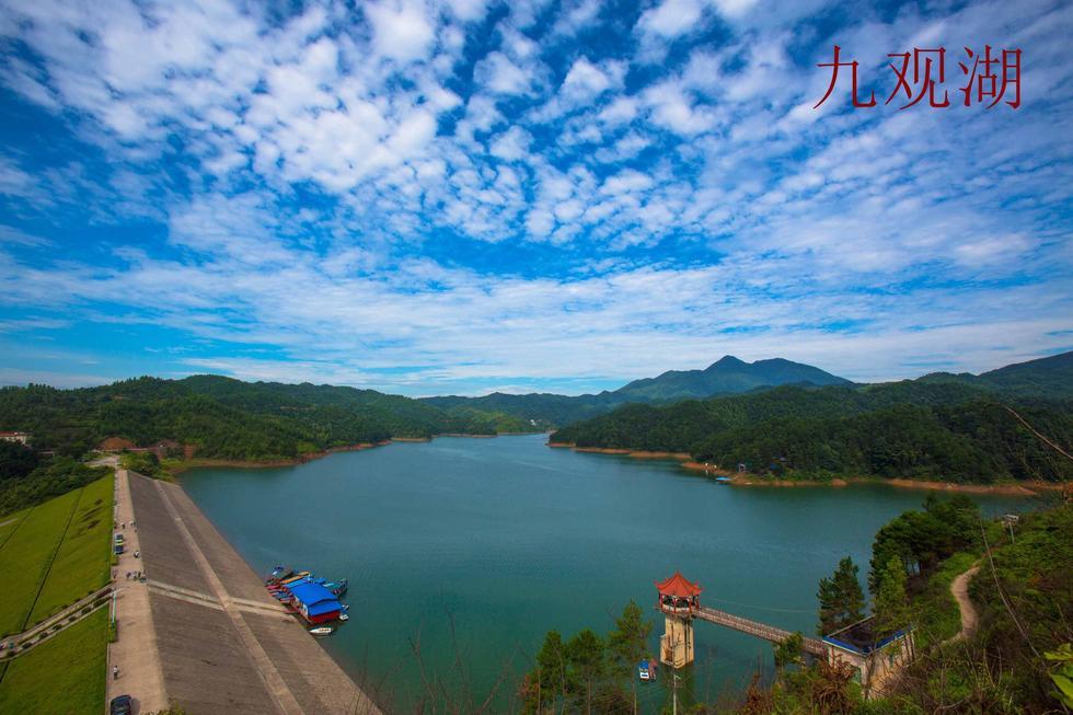 九观桥水库是水利部第一批认定的国家级水利风景区,经过开发建设,现在已集灌溉、发电、旅游休闲为一体的综合景区。九观湖水质清澈透明,纯净无污染。登临坝顶,静里观湖,九观湖湖平如境,山水相映,清风拂面,花香沁心,侧耳静听,鸟语啾鸣;乘上游艇,动中观湖,湖面波光涟涟,湖水清澈碧绿,鱼儿遨游水中;湖面观山,九观湖群山环绕,山峦起伏,连锦不断,山上苍松翠竹,四季长青,山花野果,四季不绝,飞禽走兽,繁衍自栖。