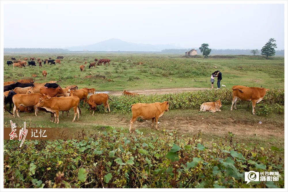 2010年10月,市民在月亮岛上踏秋游玩,田野、牛群,组成一幅诗意的田园风光画面。