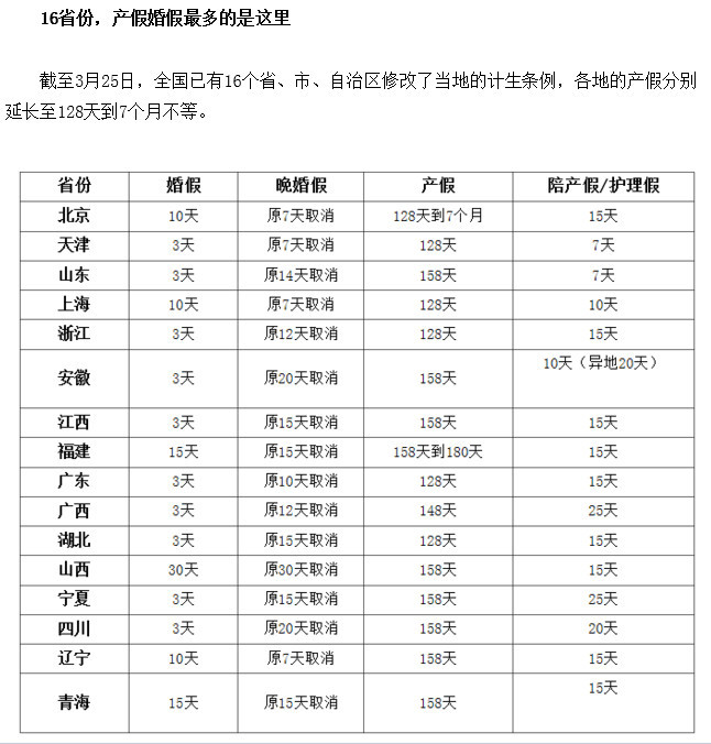 新的国家人口与计划生育法中取消了相关鼓励晚育的条款,但同时指出,符合法律、法规规定生育子女的夫妻,可以获得延长生育假的奖励或者其他福利待遇。对此,湖南在参考部分外省规定以及考虑要求增加产假、护理假的舆情的情况下,拟规定“符合法定生育条件的夫妻,女方除享受国家规定的产假(共98天)外增加产假60天,男方享受护理假15天”。