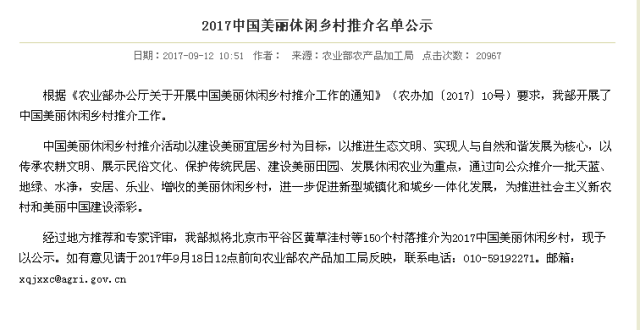 近日,农业部发布《2017中国美丽休闲乡村推介名单公示》,根据公示,经过地方推荐和专家评审,将全国150个村落推介为2017中国美丽休闲乡村。