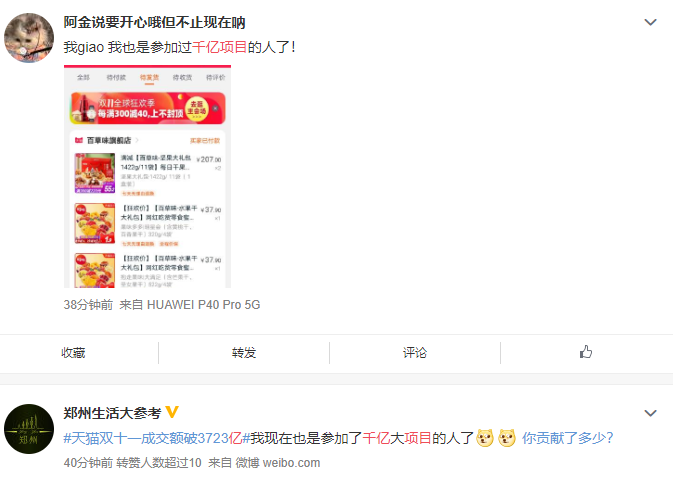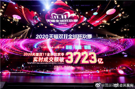天猫平台0点30分公布成交额破3723亿元。超2019年双11全天成交额2684亿元。