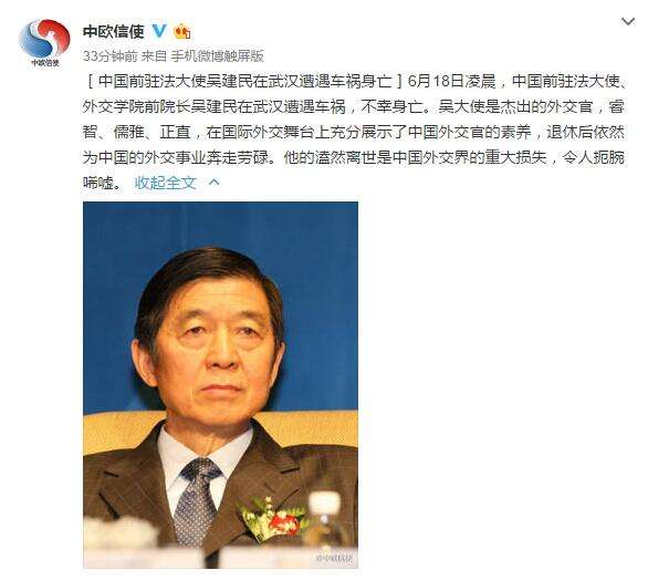外交部欧洲司官方微博@中欧信使 :【中国前驻法大使吴建民在武汉遭遇车祸身亡】6月18日凌晨,中国前驻法大使、外交学院前院长吴建民在武汉遭遇车祸,不幸身亡。吴大使是杰出的外交官,睿智、儒雅、正直,在国际外交舞台上充分展示了中国外交官的素养,退休后依然为中国的外交事业奔走劳碌。他的溘然离世是中国外交界的重大损失,令人扼腕唏嘘。