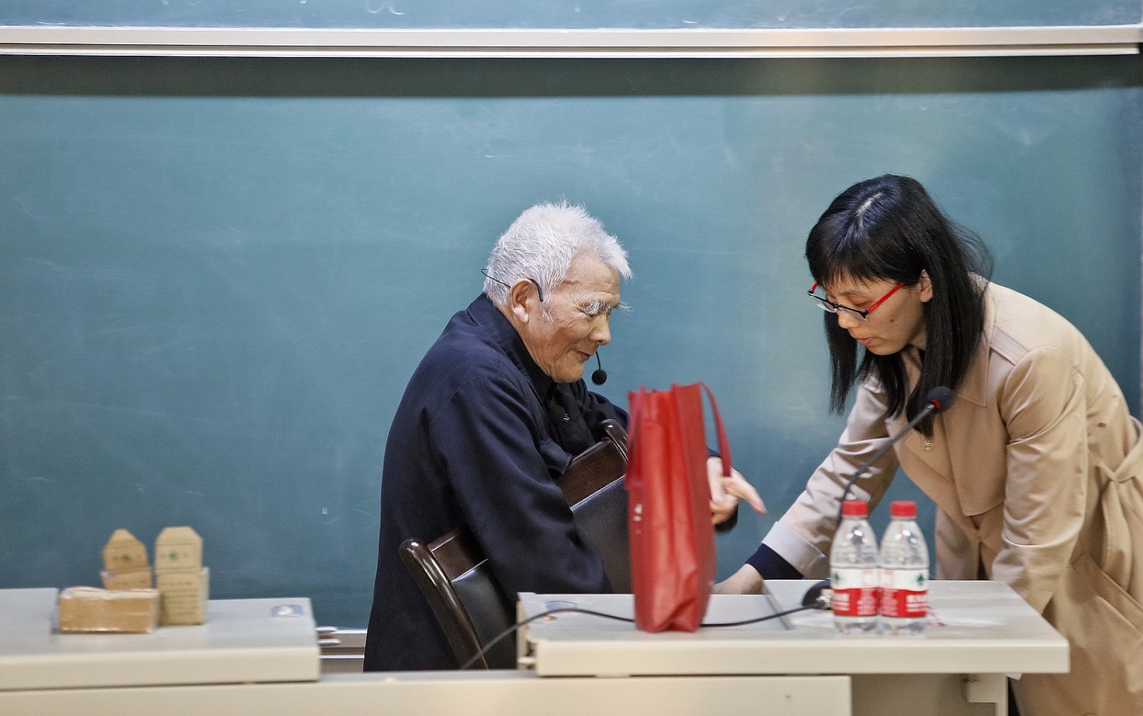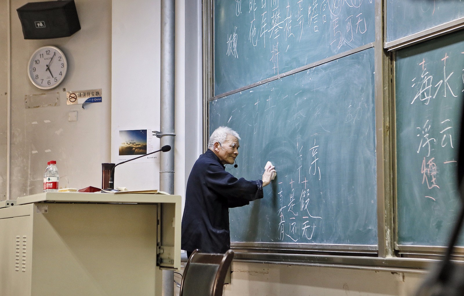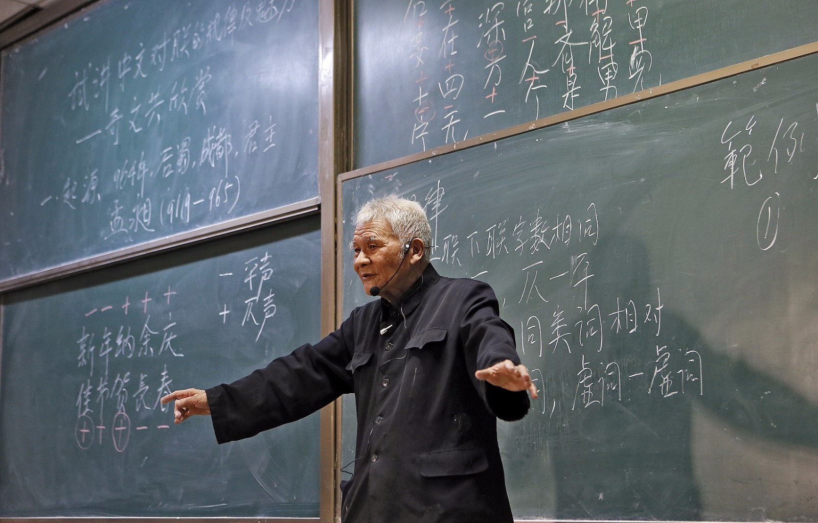 3月15日,西安建筑科技大学,94岁的网红教授潘鼎坤再次站上讲台,为同学们讲述中文对联的规律和魅力。(来源:视觉中国)