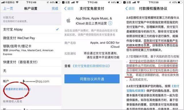 记者登录苹果手机账户,查看付款方式的设置,发现目前苹果提供的付款方式有支付宝、微信支付、银行卡、快捷支付等。记者绑定的是支付宝账户,账户下方有一行“如需重新绑定请轻点此处”的选项,但点击跳转后,显示的界面为“同意免密扣款授权协议并开通”,为何重新绑定账户变成了同意免密支付?