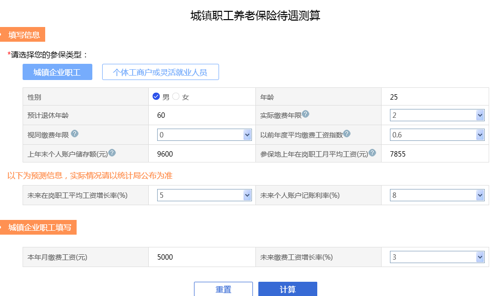 点击养老金测算,选择参保类型,分为两种:城镇企业职工,个体户或灵活就业者,然后输入一系列条件: