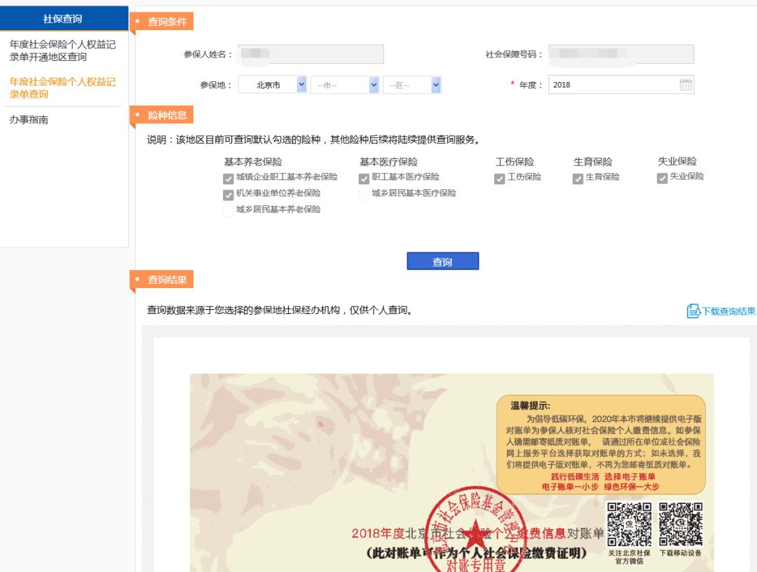小新注册后,点击社保查询,输入参保地北京,选择查询年度2018年,点击查询,很快社保对账单就出来了,还可以点击下载查询结果。