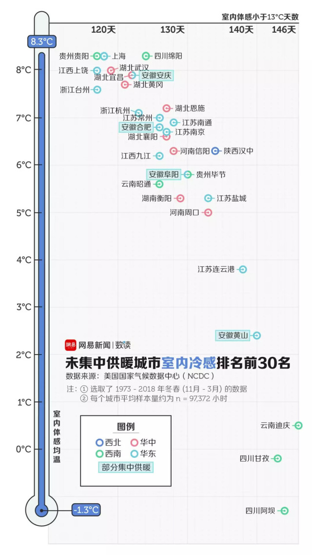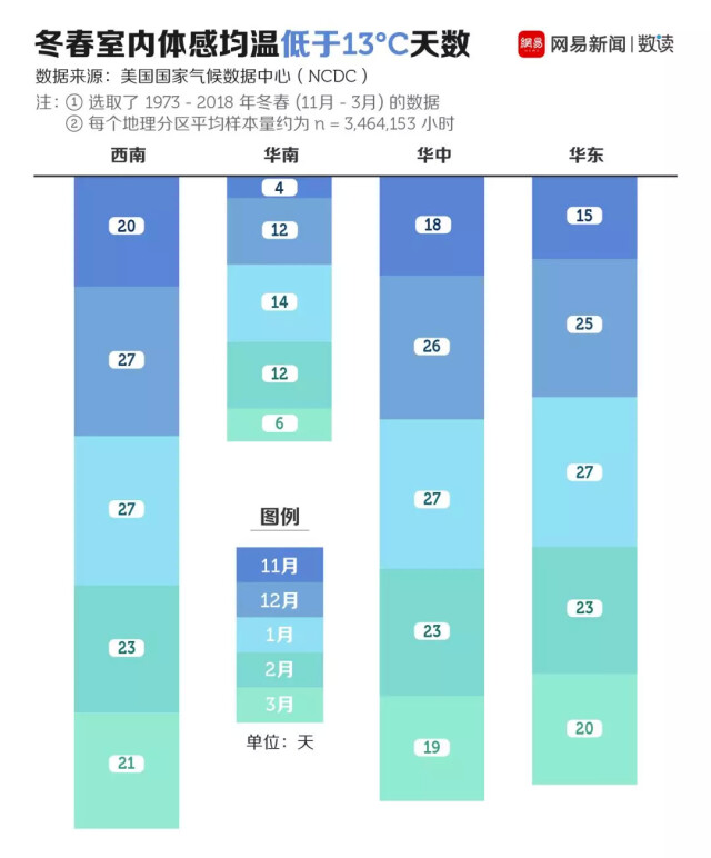 华东、华中、西南的情况则比较类似,在12月和1月,待在室内就会觉得冷,2月、3月有所缓解,但每个月也只有10天左右感觉好一点,剩下的时间依然冻得人打哆嗦。
