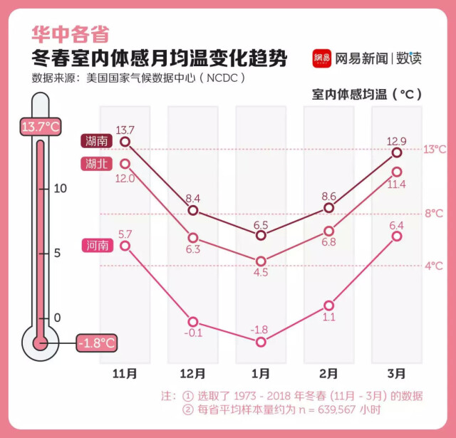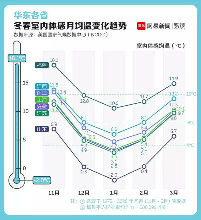 如果想在数据有限的情况下尽可能地还原个人在室内对寒冷的感受,将湿度纳入考虑的“室内体感温度”会是比“气温”更适合的指标。