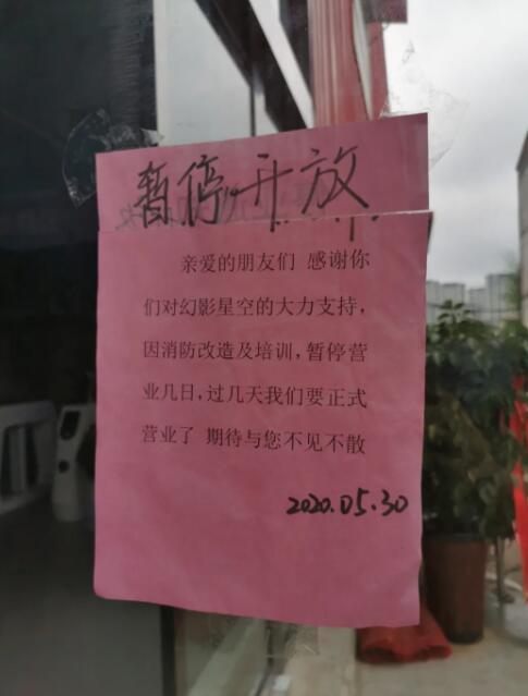 5月30日下午,记者来到幻影星空蹦床馆,大红色的外立面非常醒目,门口还摆放着几只庆祝开业的花篮,玻璃门上贴着“暂停开放”的通知。