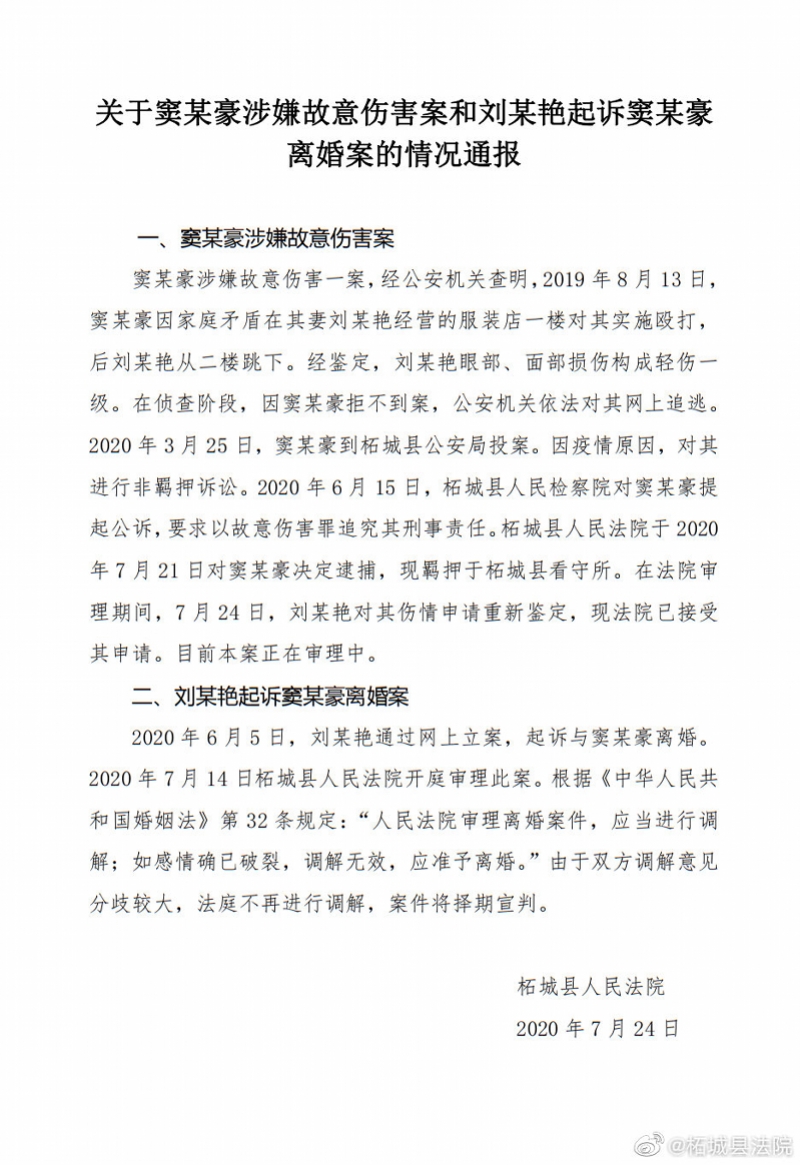长沙晚报掌上长沙7月25日讯 据南方都市报消息 近日,河南商丘刘女士婚后遭家暴一年未能离婚,为逃生选择跳楼致截瘫一事引发热议。7月24日23时许,河南省商丘市柘城县人民法院官方微博通报相关情况称,刘女士的丈夫窦某豪涉嫌故意伤害罪,现羁柙于柘城县看守所,案件正在审理中。关于离婚案,由于双方调解意见分岐较大,法庭不再逬行调解,案件将择期宣判。