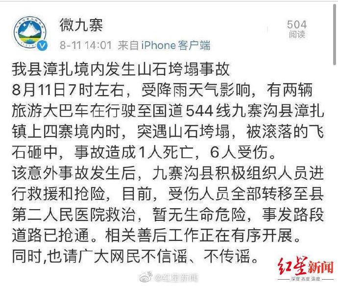长沙晚报掌上长沙8月11日讯 据红星新闻消息,8月11日上午,有网友发布视频称,九寨沟两辆旅游大巴车被落石砸中,有人员伤亡。据九寨沟县委宣传部官方微博消息称,九寨沟县漳扎境内发生山石垮塌事故,致1死6伤。九寨沟当地针对当前汛期情况, 组织人员对地灾隐患点进行拉网式排查排除隐患,确保车辆和游客游行安全。