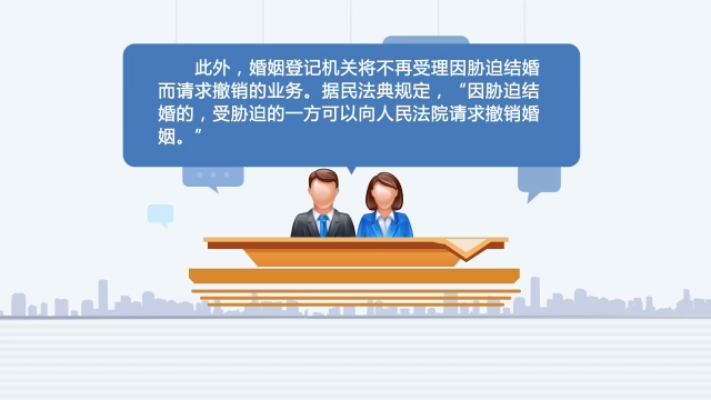 此外,婚姻登记机关将不再受理因胁迫结婚而请求撤销的业务。据民法典规定,“因胁迫结婚的,受胁迫的一方可以向人民法院请求撤销婚姻。”