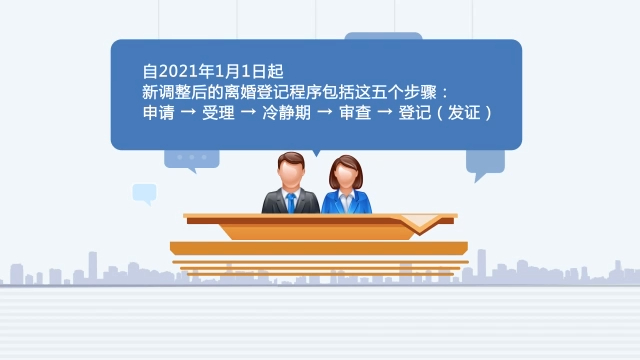 自2021年1月1日起,新调整后的离婚登记程序包括这五个步骤:申请→受理→冷静期→审查→登记(发证)。