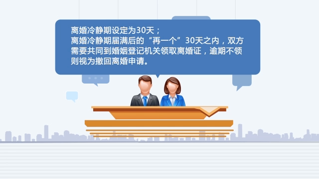 其中,离婚冷静期设定为30天;离婚冷静期届满后的“再一个”30天之内,双方需要共同到婚姻登记机关领取离婚证,逾期不领则视为撤回离婚申请。
