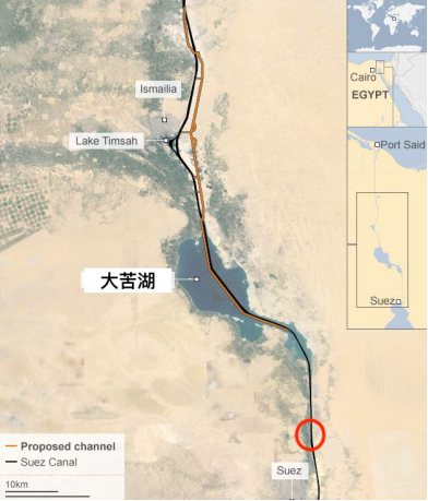 于是,埃及总统阿卜杜勒-法塔赫·塞西在2014年上任不久后,便下令修建一条35公里长的“新苏伊士运河”(如下图橙色线条部分),让大苦湖以北的航道实现双向通行,以减少船只搁浅对河道通行的影响。