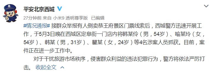 北京警方:倒卖恭王府门票4名涉案人员被抓获 稿源:平安北京西城微博2021-05-04 12:3 您的浏览器不支持 video 标签。 您的浏览器不支持 audio 标签。 长沙晚报掌上长沙5月4日讯 据平安北京西城微博消息 北京西城警方通报:接群众举报有人倒卖恭王府景区门票线索后,西城警方迅速开展工作,于5月3日晚在西城区定阜街一门店内将韩某伶(男,54岁)、喻某玲(女,54岁)、韩某(男,31岁)、瞿某(女,24岁)等4名涉案人员抓获。目前,案件正在进一步工作中。 对于干扰旅游市场秩序,侵害群众利益的违法犯罪行为,警方将依法严厉打击。 【作者:】 【编辑:张日】 长沙晚报社版权声明 关键词:北京 >>我要举报