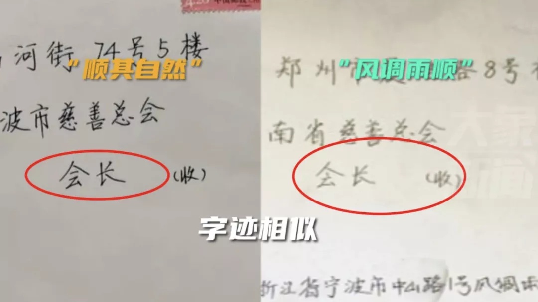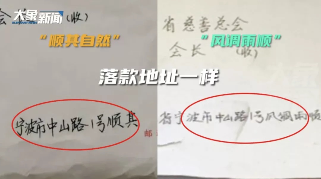 记者找到之前“顺其自然”向宁波市慈善总会捐款的落款地址,对比发现,两者不仅地址都是现实中不存在的“宁波市中山路1号”,而且字迹几乎一模一样。