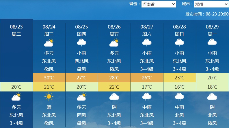 城市中,像是西安和郑州,23日两城市最高气温还有30℃出头,仍有夏日暖热;下周初就将降到20℃出头,累积降温近10℃,感觉上短短几天就从夏转换到了秋。