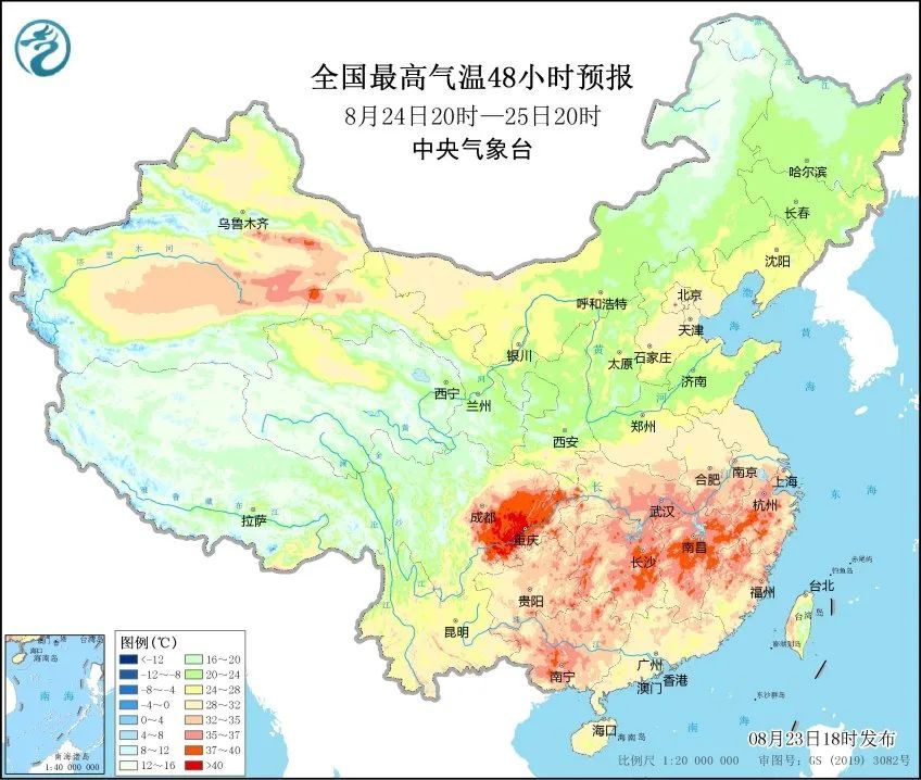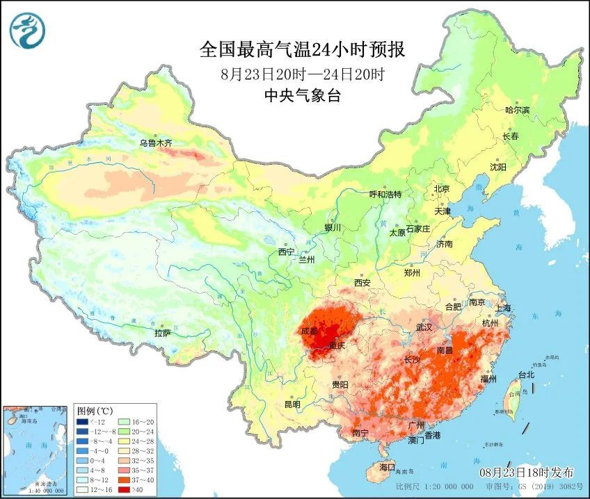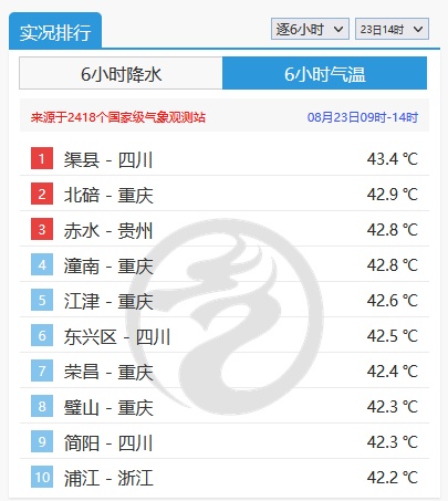 但是,与此形成强烈反差的是四川盆地、重庆、湖北东南部、湖南北部、江西大部、浙江、福建等地。23日14时,上述地区仍有大片40℃及以上的高温天气。14时全国气温排行榜上,四川、重庆、浙江均有站点上榜,上榜站点气温普遍在42℃以上。