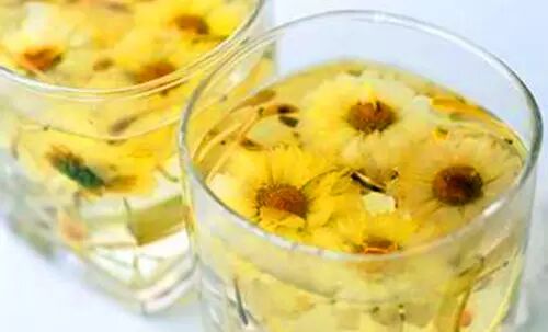 2、菊花。疏散风热、清利头目、平抑肝阳。菊花有黄菊花与白菊花之分,黄菊花擅于疏散清泻,白菊花养肝阴作用较强。取菊花5~6朵,开水泡服,用于因热伤风、肝火盛所致的头晕头痛、目赤肿痛等。