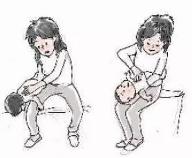 方法二:可将患儿翻转过来,面朝上,放在大腿上,托住其背部,头低于身体,用食指和中指猛压其下胸部(两乳头连线中点下方一横指处)。反复交替进行拍背和胸部压挤,直至异物排出。如情况严重,要立即送往医院。