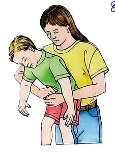 在孩子背后,双手放在孩子肚脐和胸骨间,一手握拳,另一手包住拳头;