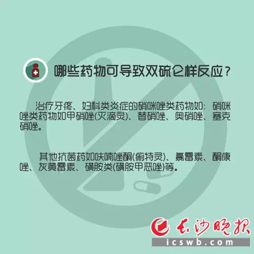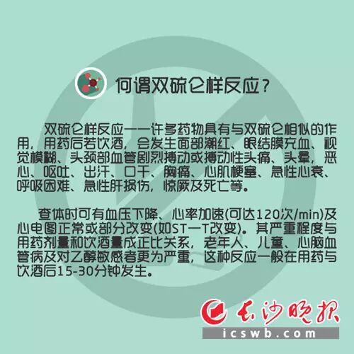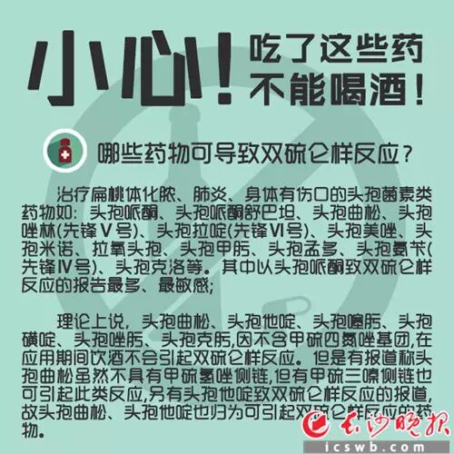 据介绍,还有些人吃了消炎药后再吃藿香正气水、酒心巧克力甚至仅用酒精处理皮肤都会产生双硫仑样反应,市民一定要引起特别重视。很多人以为,一颗药吃下去之后,也许半天最多一天就没有效果了,所以再继续吃第二颗。