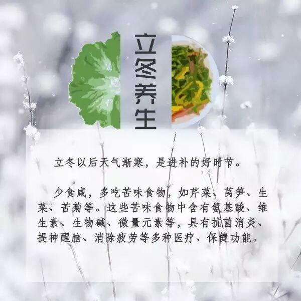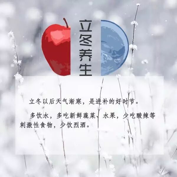 5、【防"点"病】立冬气候寒冷,容易诱使慢性病复发或加重,应留意防寒保暖,尤其是预防大风降温天气对机体的不良刺激,备好急救药品。同时还应重视耐寒锻炼,提高御寒及抗病能力,预防呼吸道疾病发生。