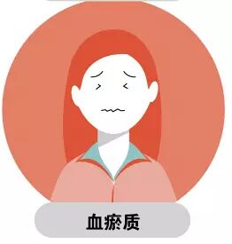 面色多晦暗,口唇暗淡或紫,眼眶黯黑,肌肤甲错,或生症瘕,刺痛,痛处固定不移,舌体黯紫有瘀点,脉细涩或脉率不齐。易患出血,症瘕,中风,胸痹(冠心病)等病。